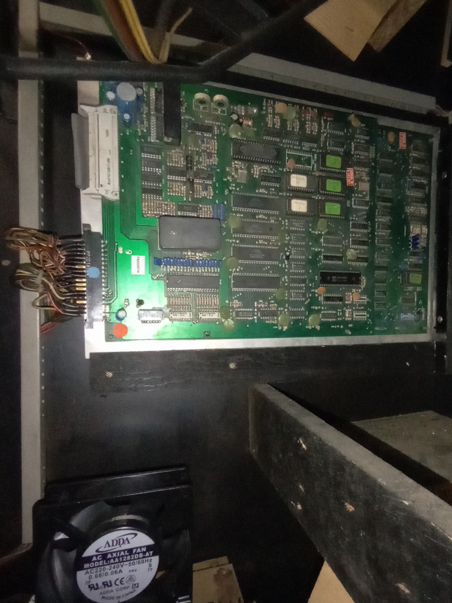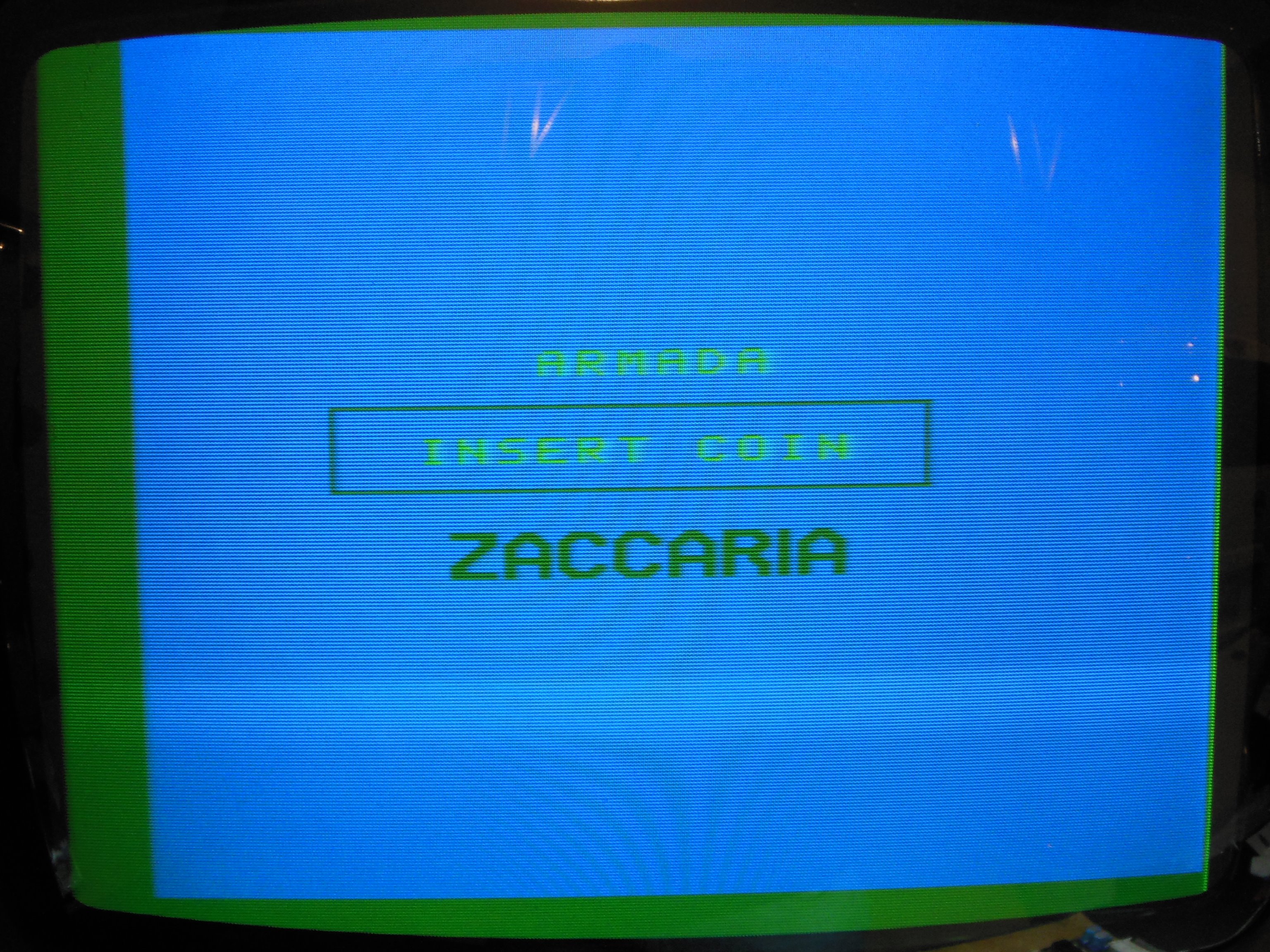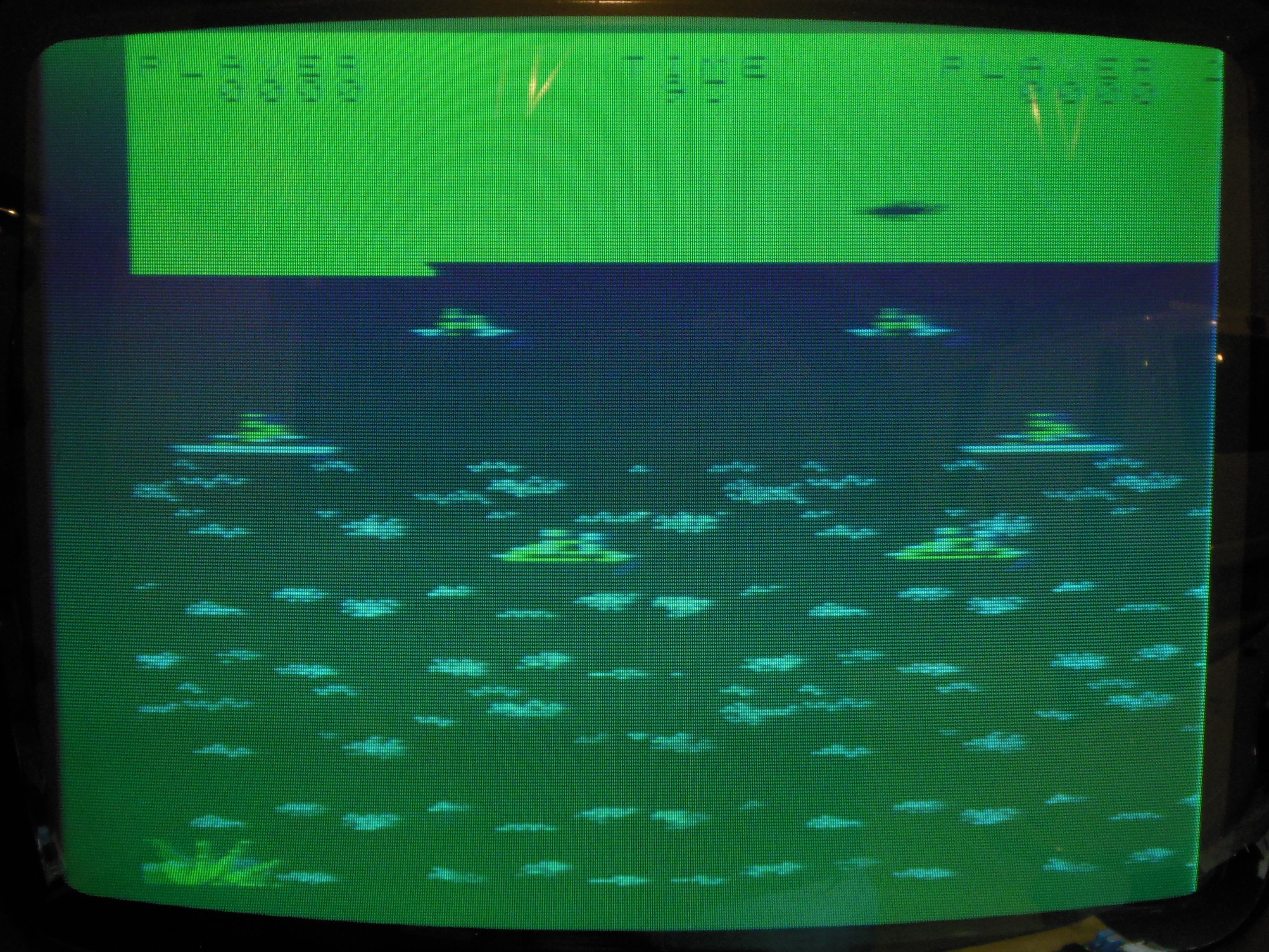 The game PCB on its original mounting plate fit perfectly in the Super Cobra cabinet and the Hantarex MTC-900 was switched over to the inverted video input option by changing a small plug on the chassis. Armada is a horizontal game, but this was good enough to be able to see how it looked and played on an original monitor.