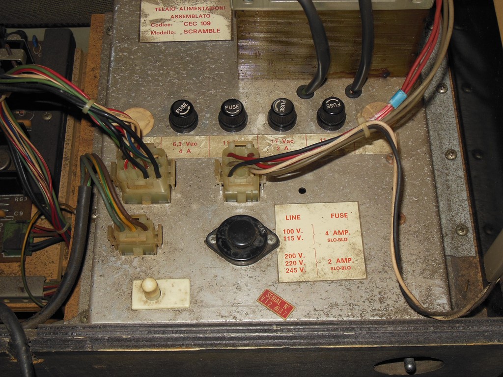 The power plinth and fan were dirty but looked complete otherwise. The PCB cage obscured the view of the PCB, but it looked clean. Towards the top, one socket of the marque light was dangling into the back of the cabinet so repair work was needed on the light assembly.