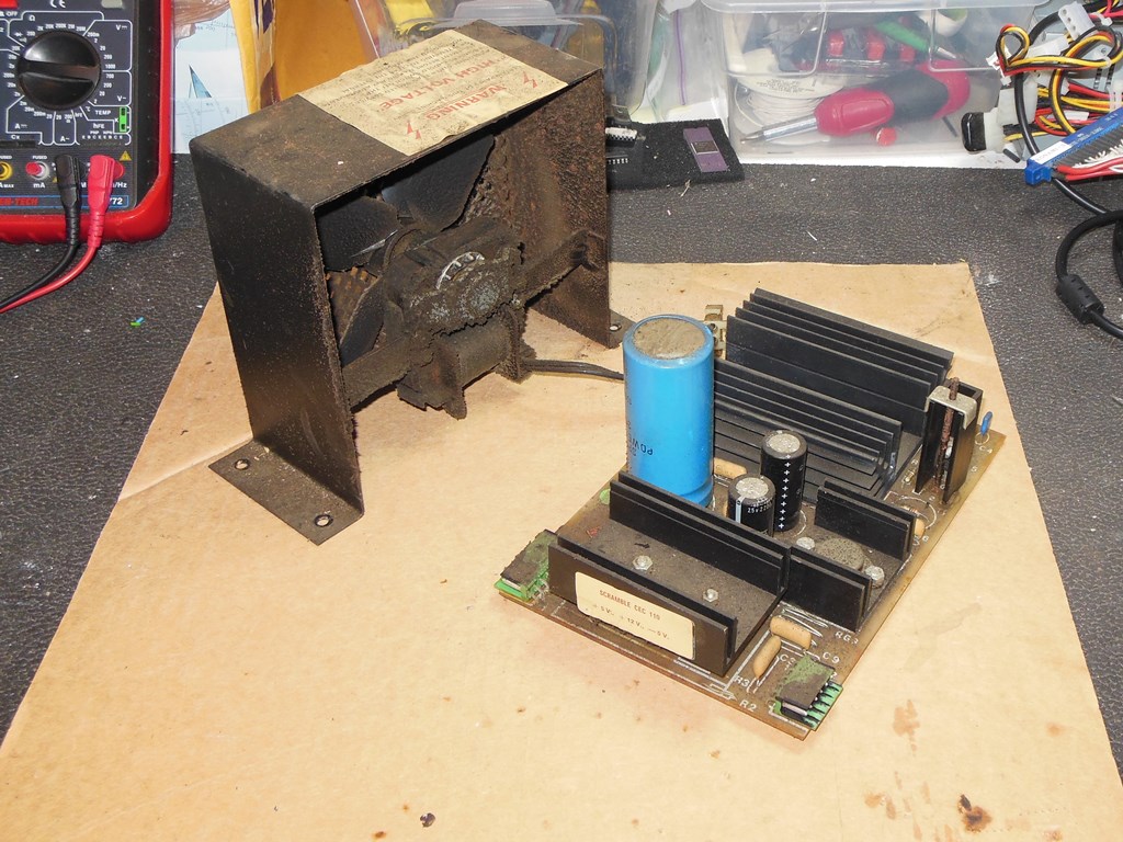 Initial testing in the cabinet confirmed that the fan was working properly. Both the fan and power supply regulation board were reinstalled back in the cabinet. The power regulation PCB appeared to be in good condition and working properly and aside from cleaning didn't need any further work.
