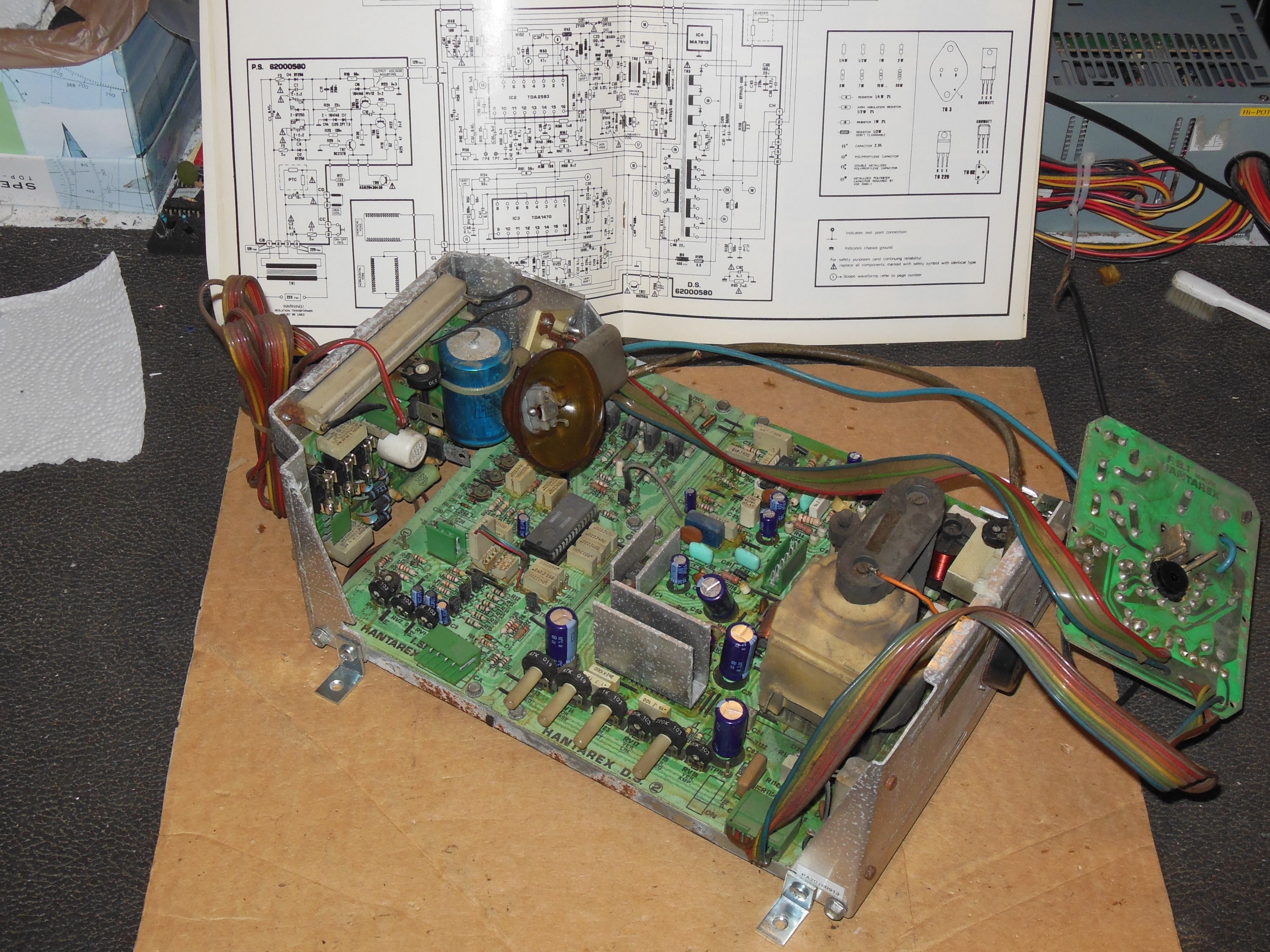 The 200V test point TP10 measured 165VDC and the 128V measured 107VDC. The B+ adjustment pot had no effect indicating a fault on the power regulator board. Both back-to-back diode checks and out of circuit Hfe checks passed on all the transistors but a close visual inspection identified diode D5 (1N4148) was shattered. Replacing D5 and reassembling the chassis found B+ voltage close to 126VDC and it was set at 126VDC. Picture quality also looked good.