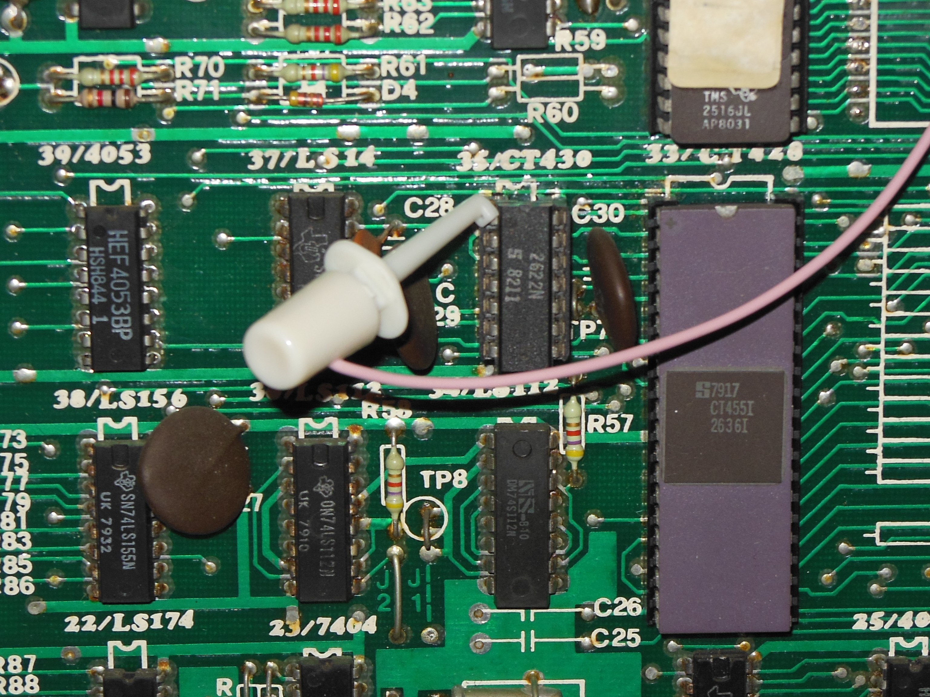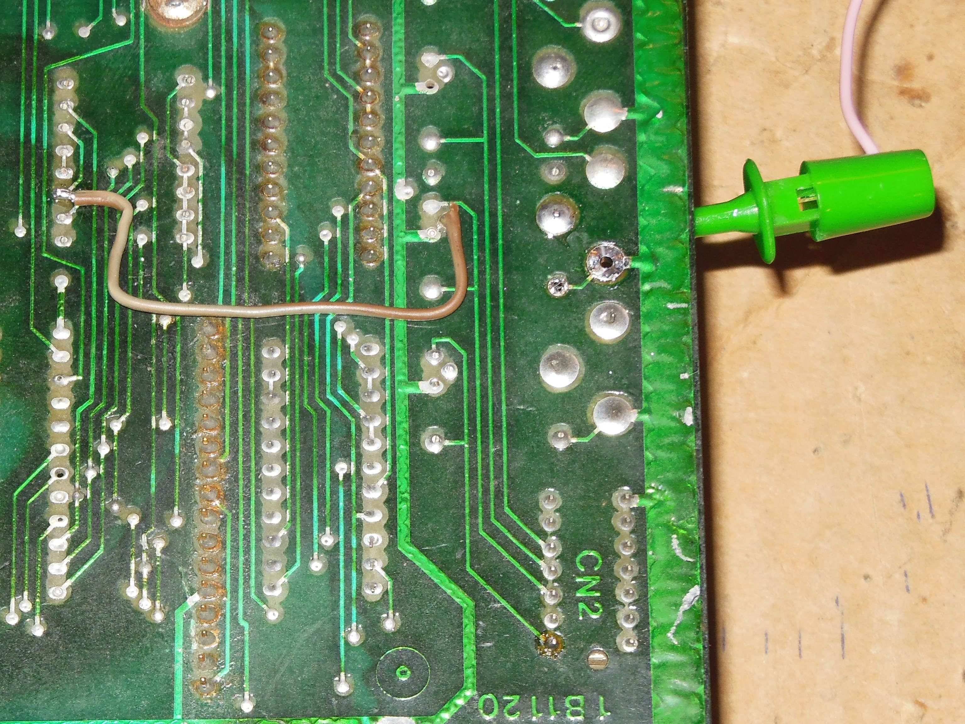 Composite sync was available directly from the 2621 pin 2 however the video output signal was tapped from the "colour" PROM output located underneath the sound PCB. To make the PCB easier to connect to without the need to remove the audio board, a wire strap was used to connect to a spare header pin. The modification was done on both game PCBs.