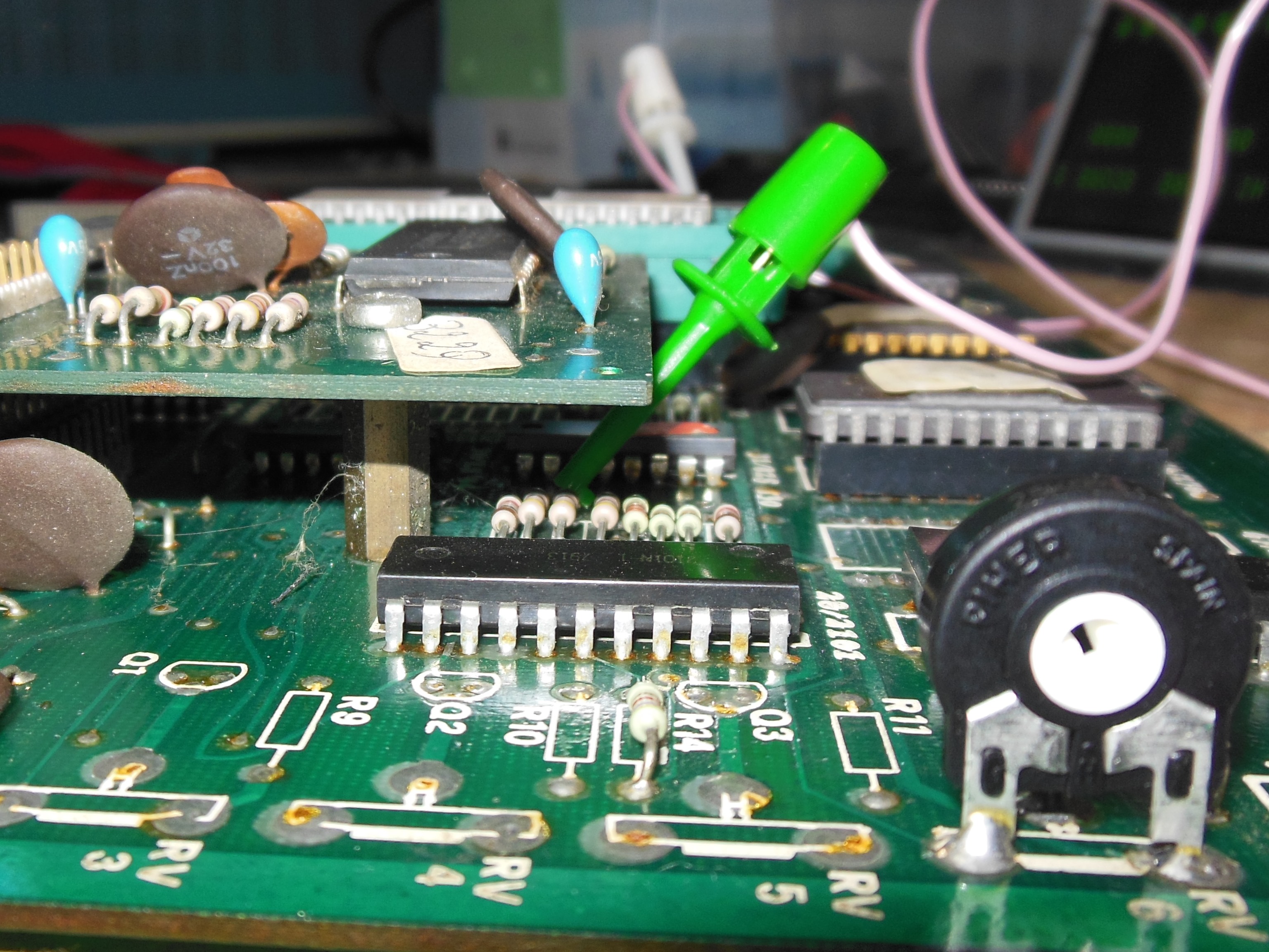 Pre-show testing of this spare PCB found that it intermittently didn't boot or booted but then crashed. Testing with the Arduino ICT found ROM, RAM and interrupts working OK. Video output also seemed intermittent. Checking the 2621 sync generator found output pin 1 (~C.SYNC) had a ~0.7v high. Replacing it didn't fix the low output voltage. Tracing forwards, the signal was an input to IC 31 pin 14 (82S130), the "colour" PROM. Checking other outputs of the 2621 sync generator found pin 6 was also impacted by clamping. Carefully removing IC 31 to preserve it (it was very diificult to replace) allowed the 2621 outputs to be full swing. The act of removing IC 31 appeared to have improved the clamping - it was still around ~2V high and was unstable but hovered high enough to not impact video anymore. Since the PCB was working reliably again it was left as is with an ongoing investigation to locate a replacement IC 31 PROM.