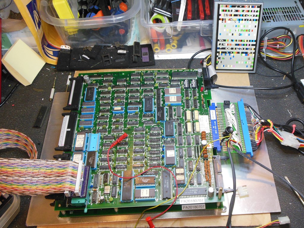 I decided to prepare a spare board for the cabinet in case of future board failure. One spare board set already seemed to be working OK except for intermittent explosions so again I applied the noise cap kit & design error fix as had been applied to the previous board set.