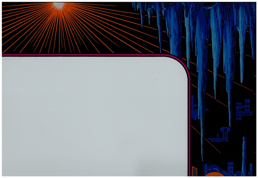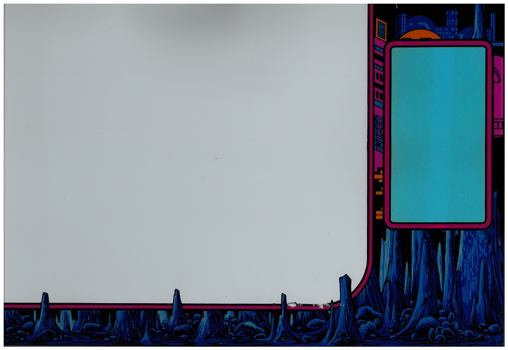 I removed the control panel in order to remove the monitor glass for scanning. The cabinet has a molded inner surround around the CRT set into a square cutout in the frame that thus allows the monitor to be used in either horizontal or vertical. Similarly the monitor glass has square artwork to match.