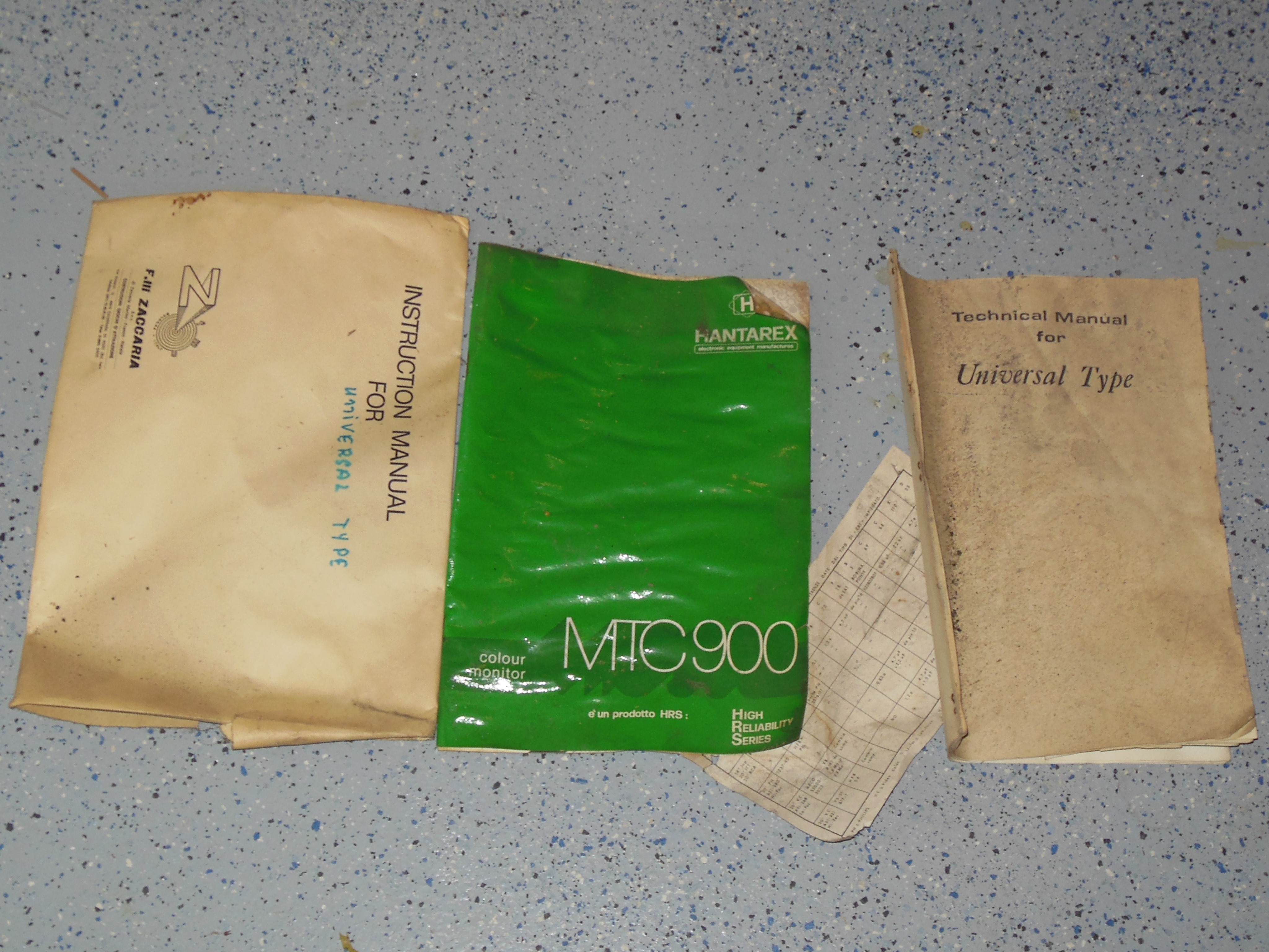 In the bottom of the cabinet was a manual packet with a Universal Type technical manual inside and an MTC-900 manual that had was entirely fused into a rigid board, presumably from long term moisture exposure. The enclosed CRT configuration sheet was forever one with that manual.