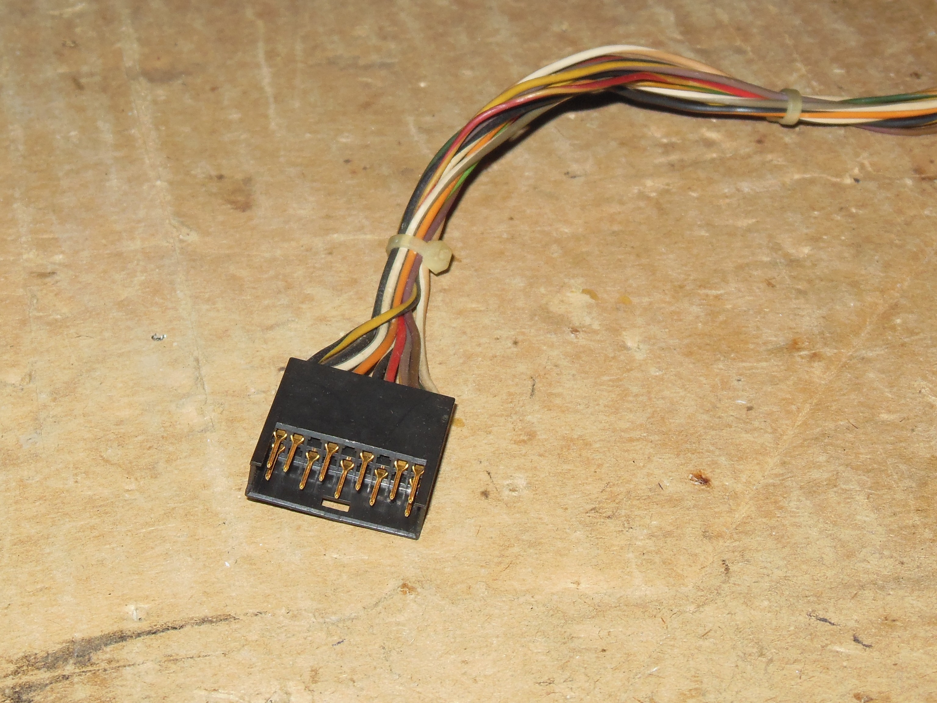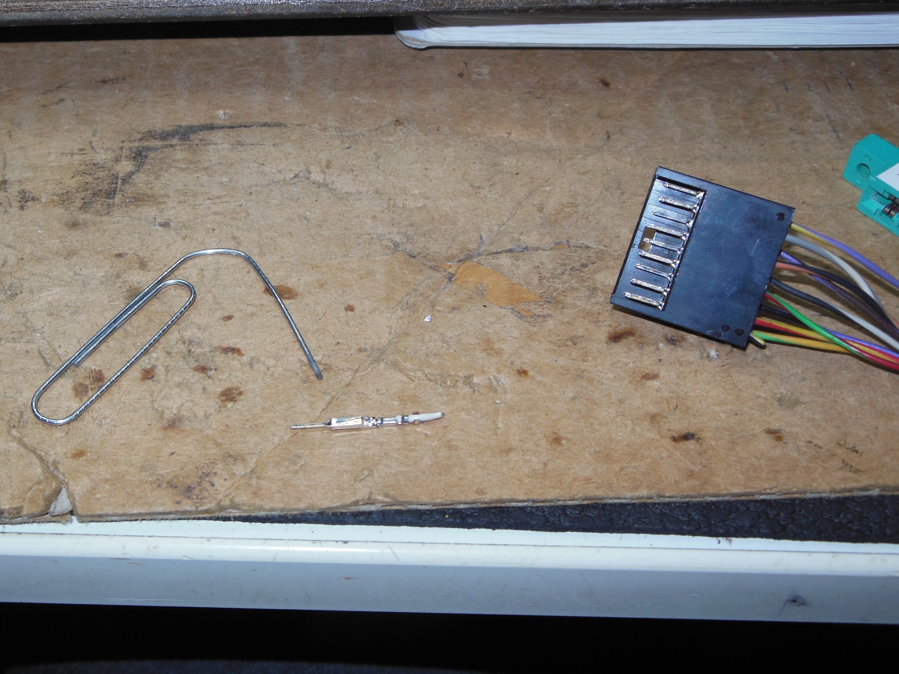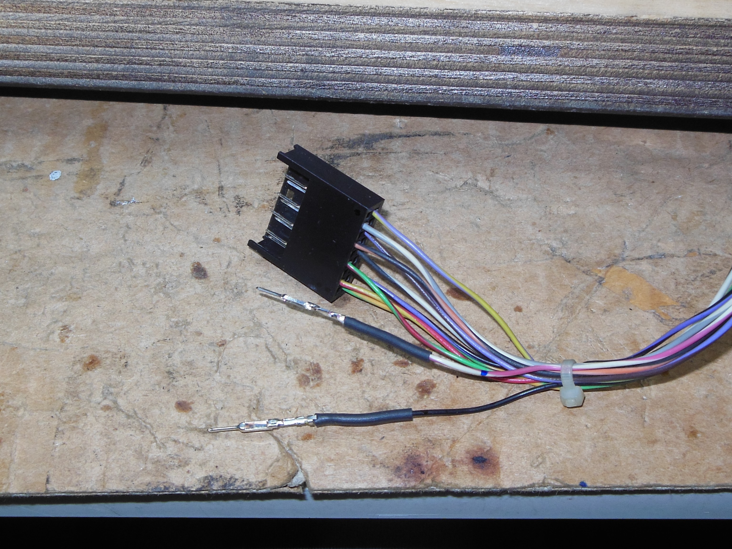 The two cut pins used for the fly leads (I) and (II) above were repaired. The cut was too close to the housing to solder directly so the pins were removed using a paperclip, the cut repaired and pins reinserted.