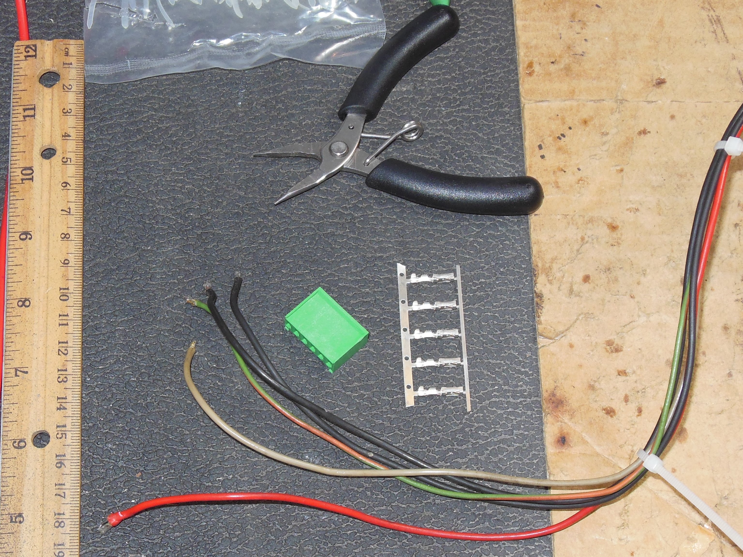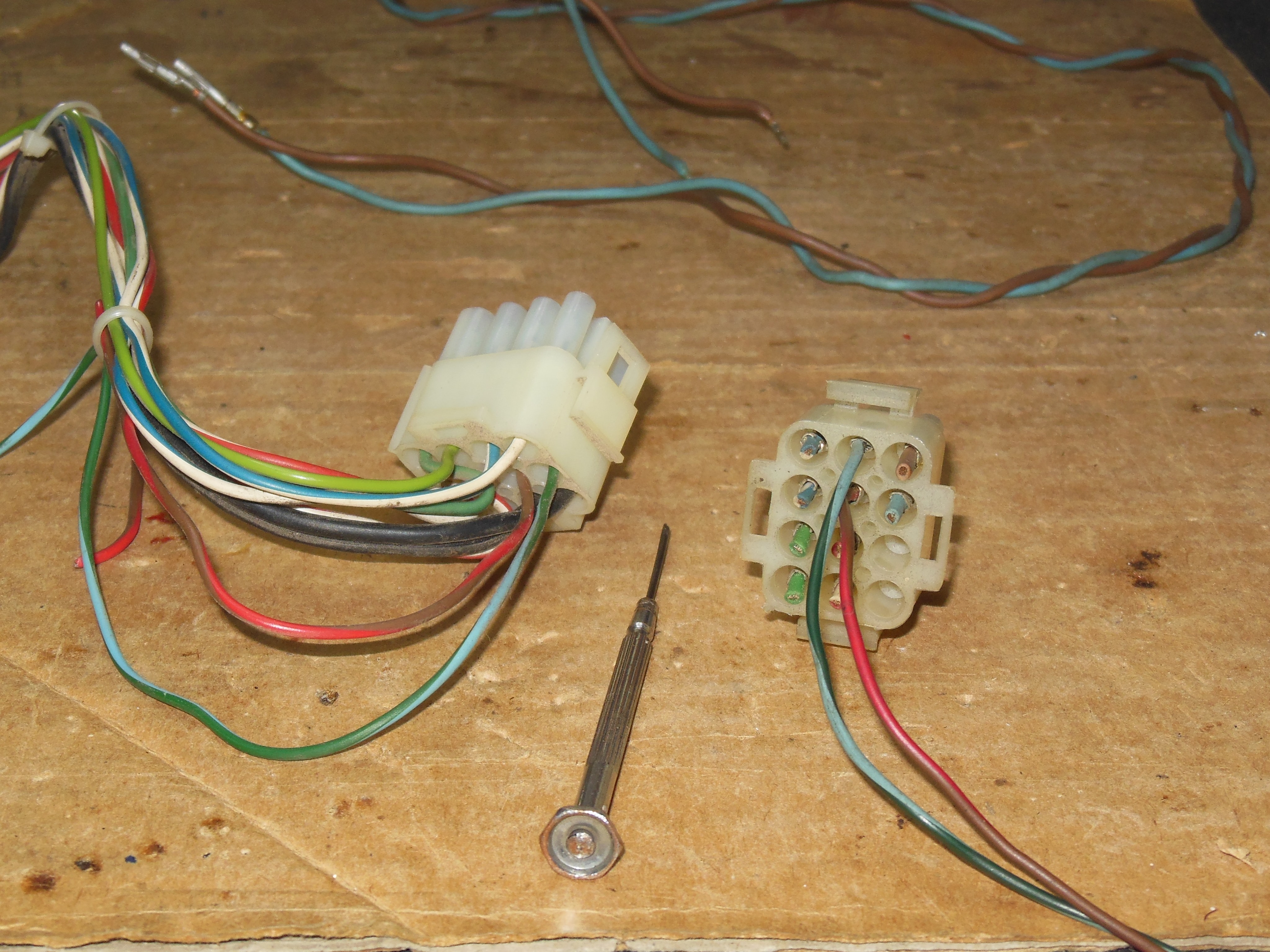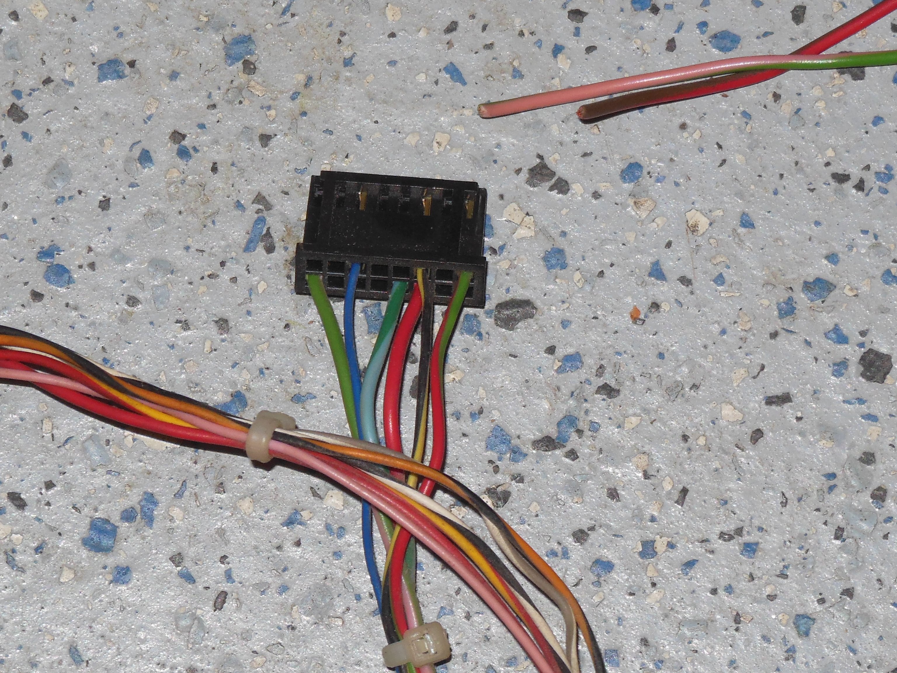 The two cut pins used for the fly leads (I) and (II) above were repaired. The cut was too close to the housing to solder directly so the pins were removed using a paperclip, the cut repaired and pins reinserted.