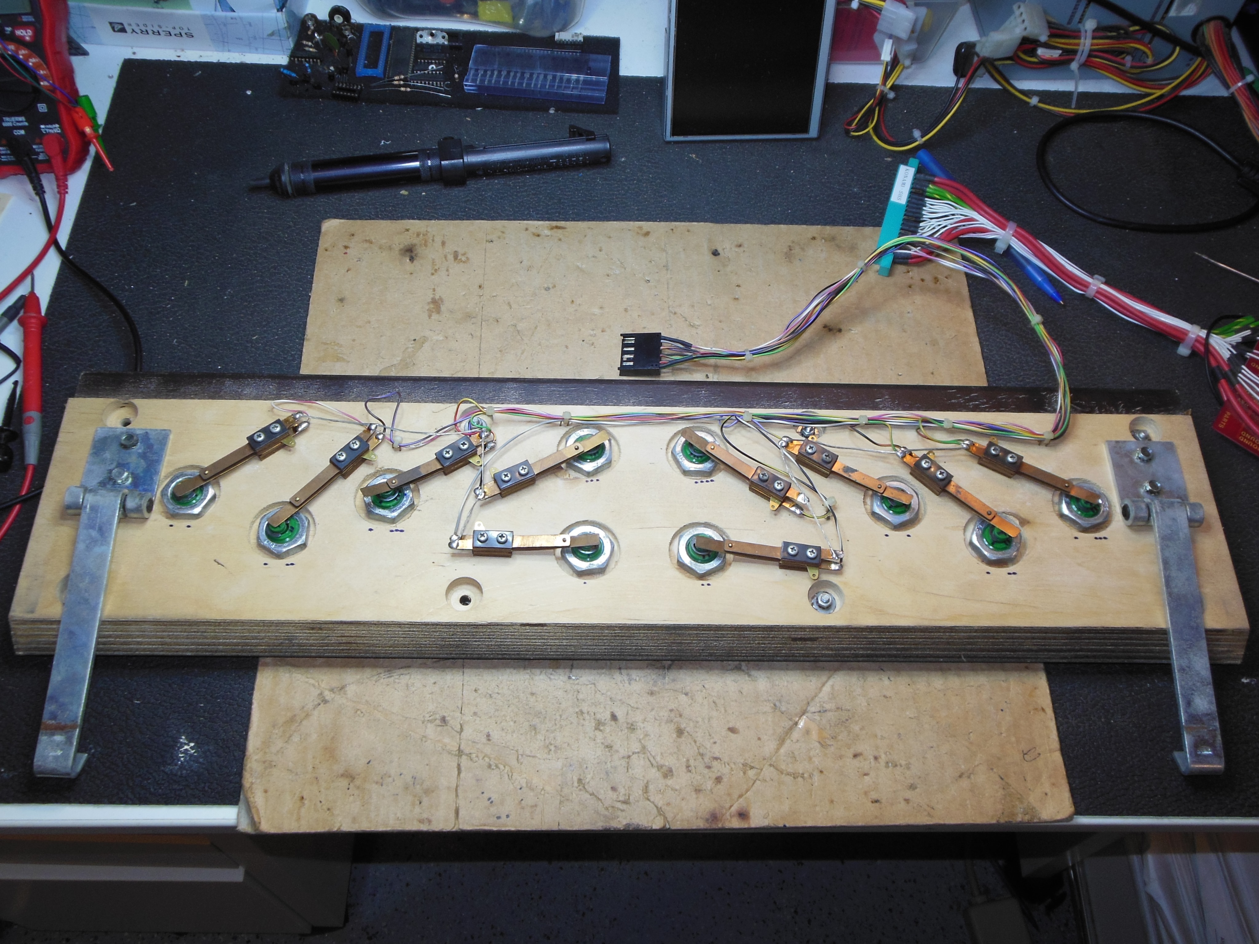 A spare Astro Wars control panel cable set donated two wires to add to the existing 8 input Universal control panel cable to make the 10 inputs needed for Hyper Olympic.