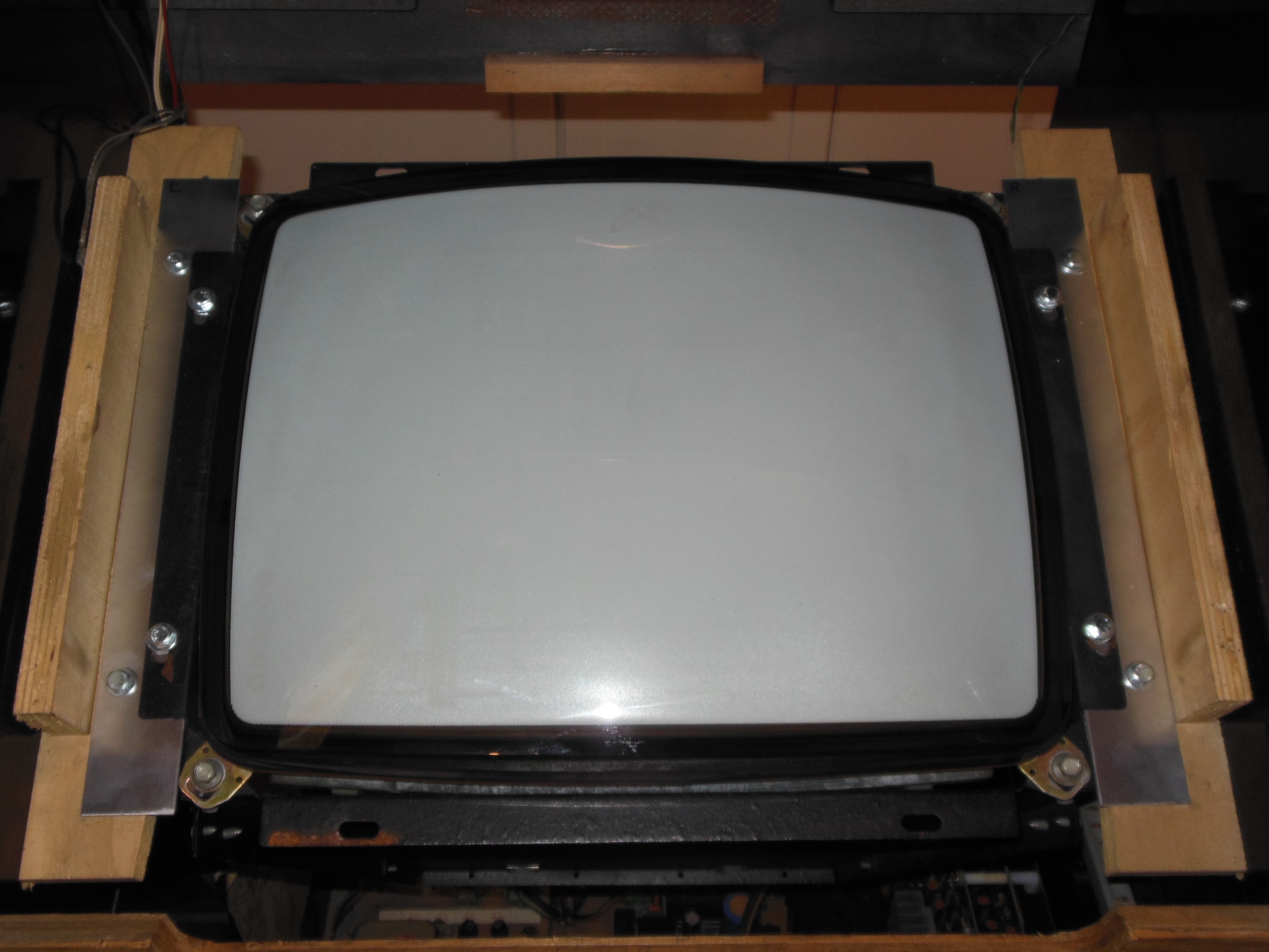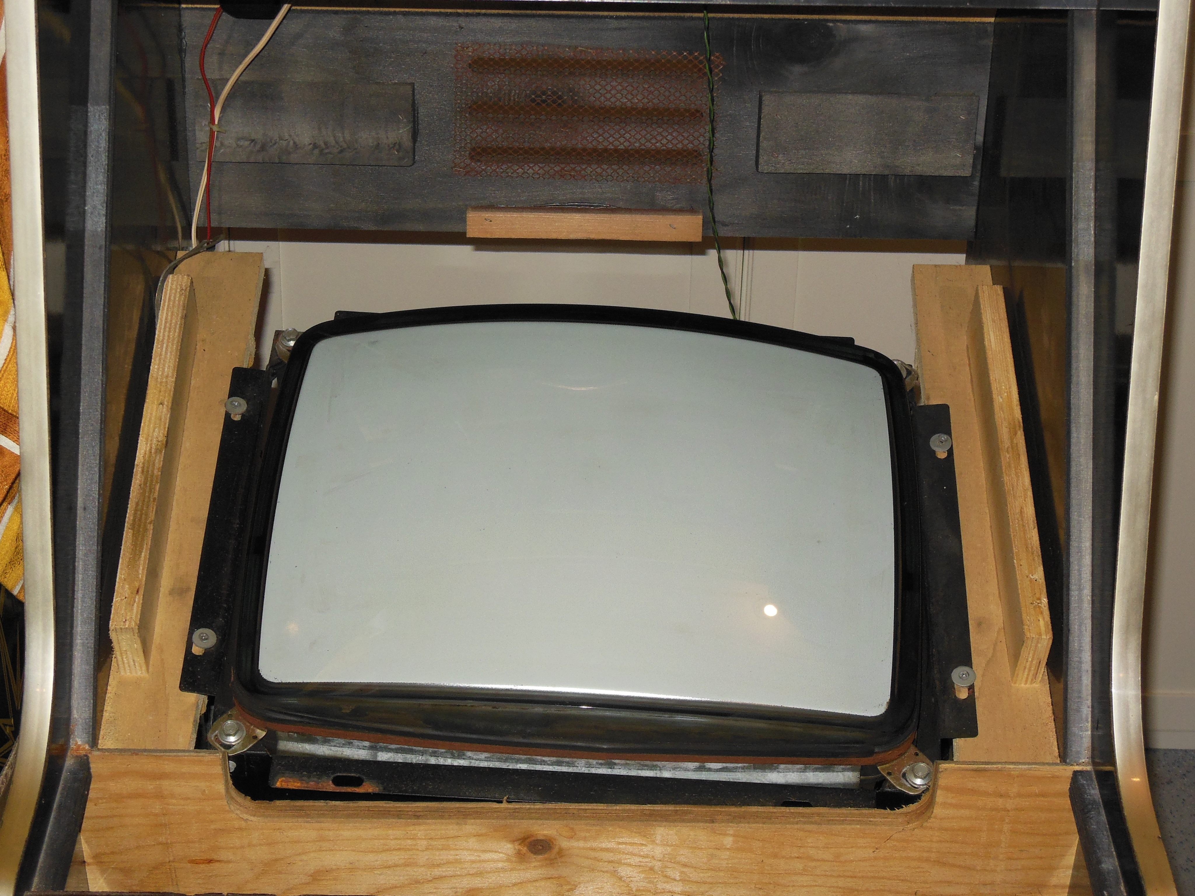The monitor surround was a vertical version that had been cut & taped to fit the horizontal monitor. It was incomplete and the plan was to make a new horizontal surround. The monitor CRT was dirty and nicotine stained. Both side brackets had been badly cut down and were now too narrow for the monitor to fit safely. It would need new custom spacer plates and some woodwork to securely fit the monitor in the correct position :(