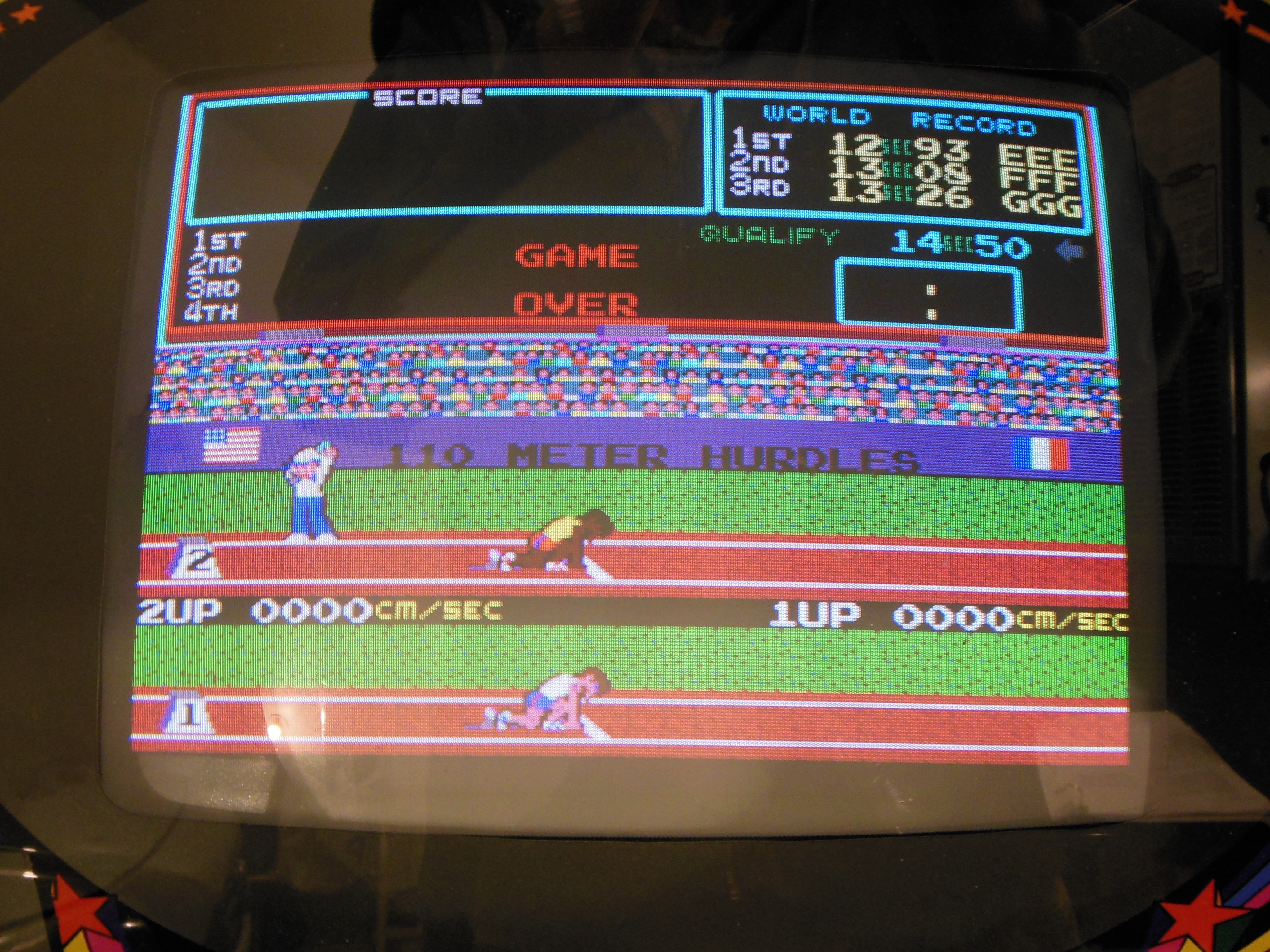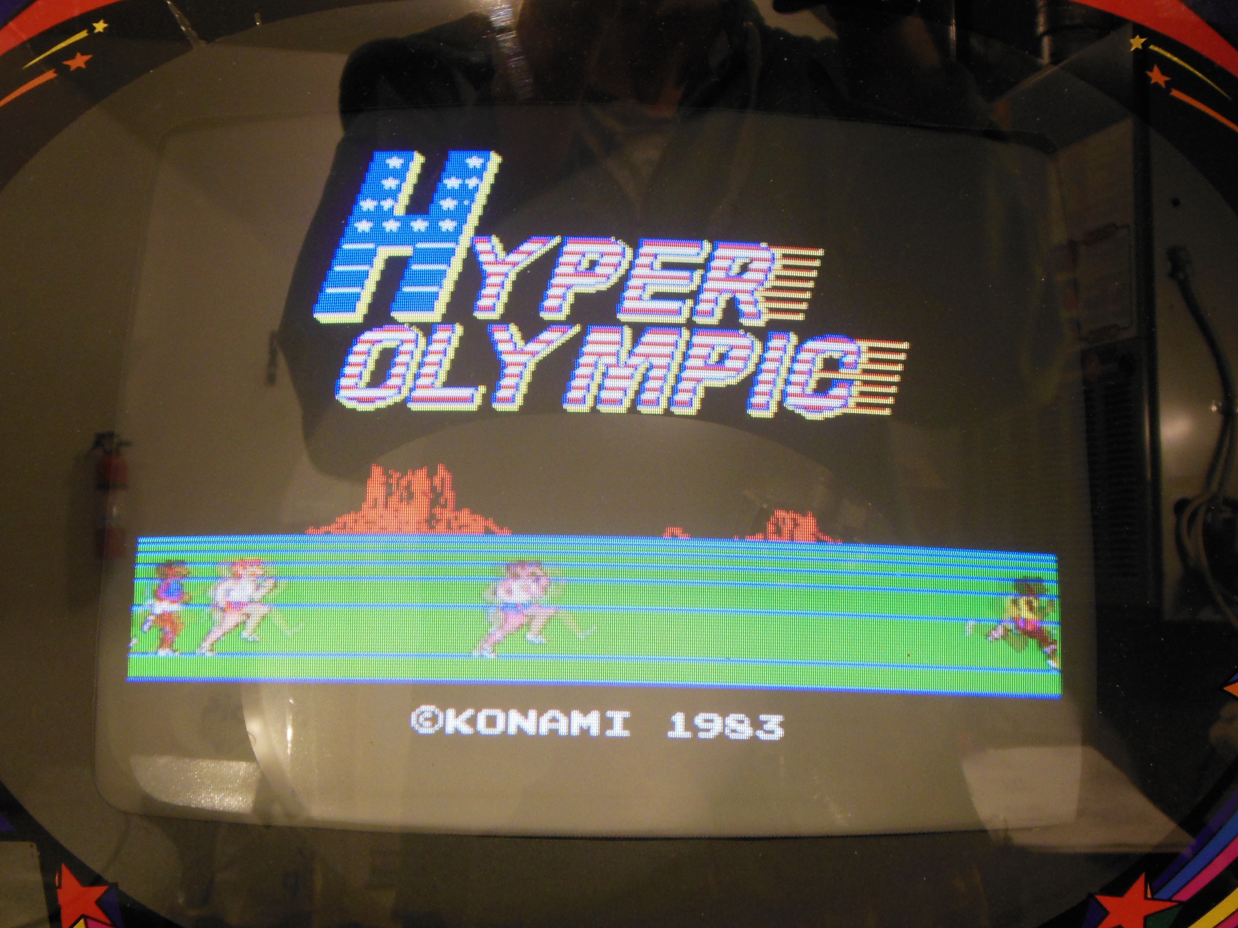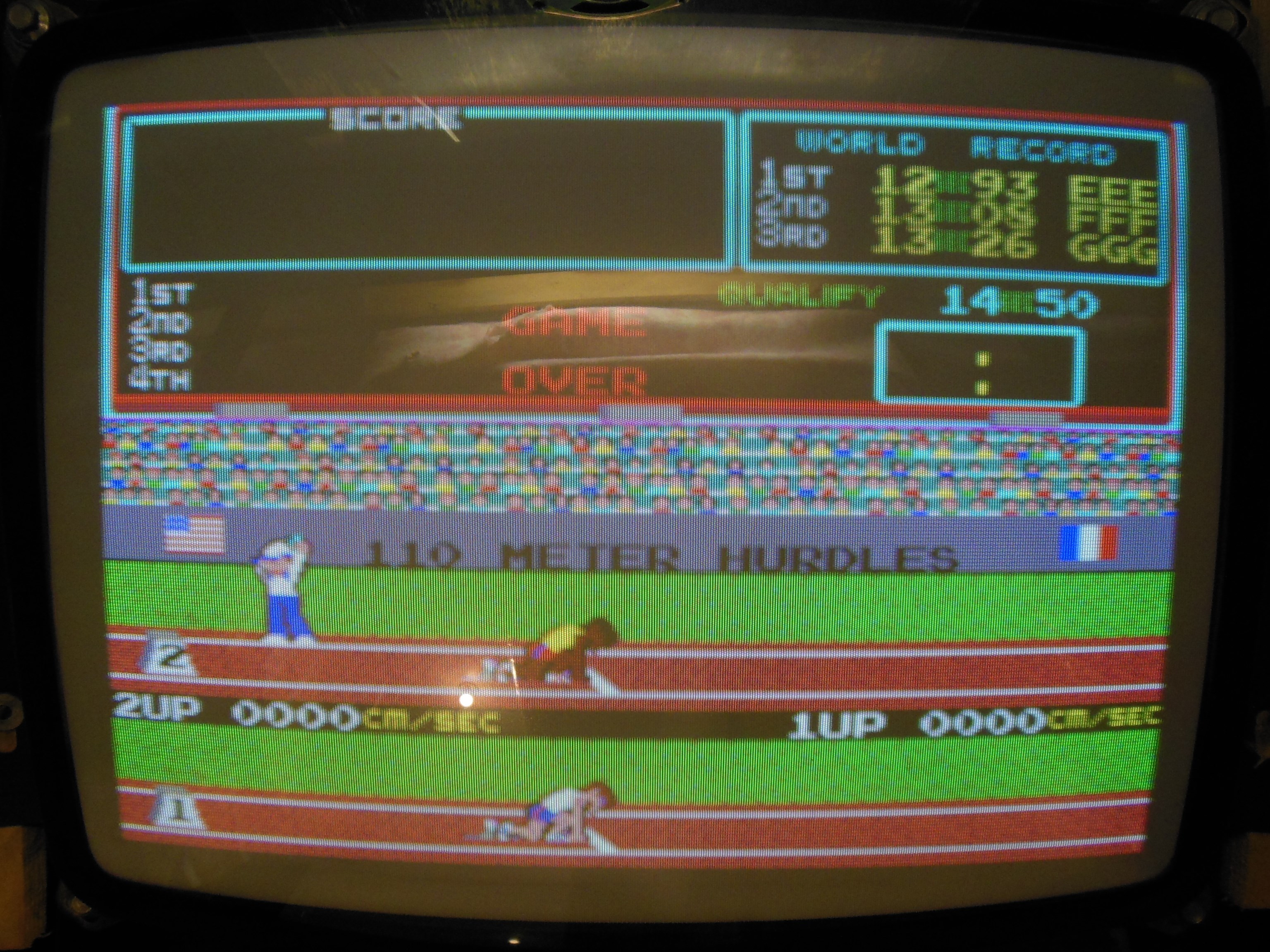 The background graphics corruption also responded to flexing that was traced to ROM IC 16H. Cleaning & reseating the IC fixed the corruption. The relevant EPROMS from Hyper Olympic PCB PA20230912 were swapped over to convert the game to Hyper Olympic for use as a spare game PCB.