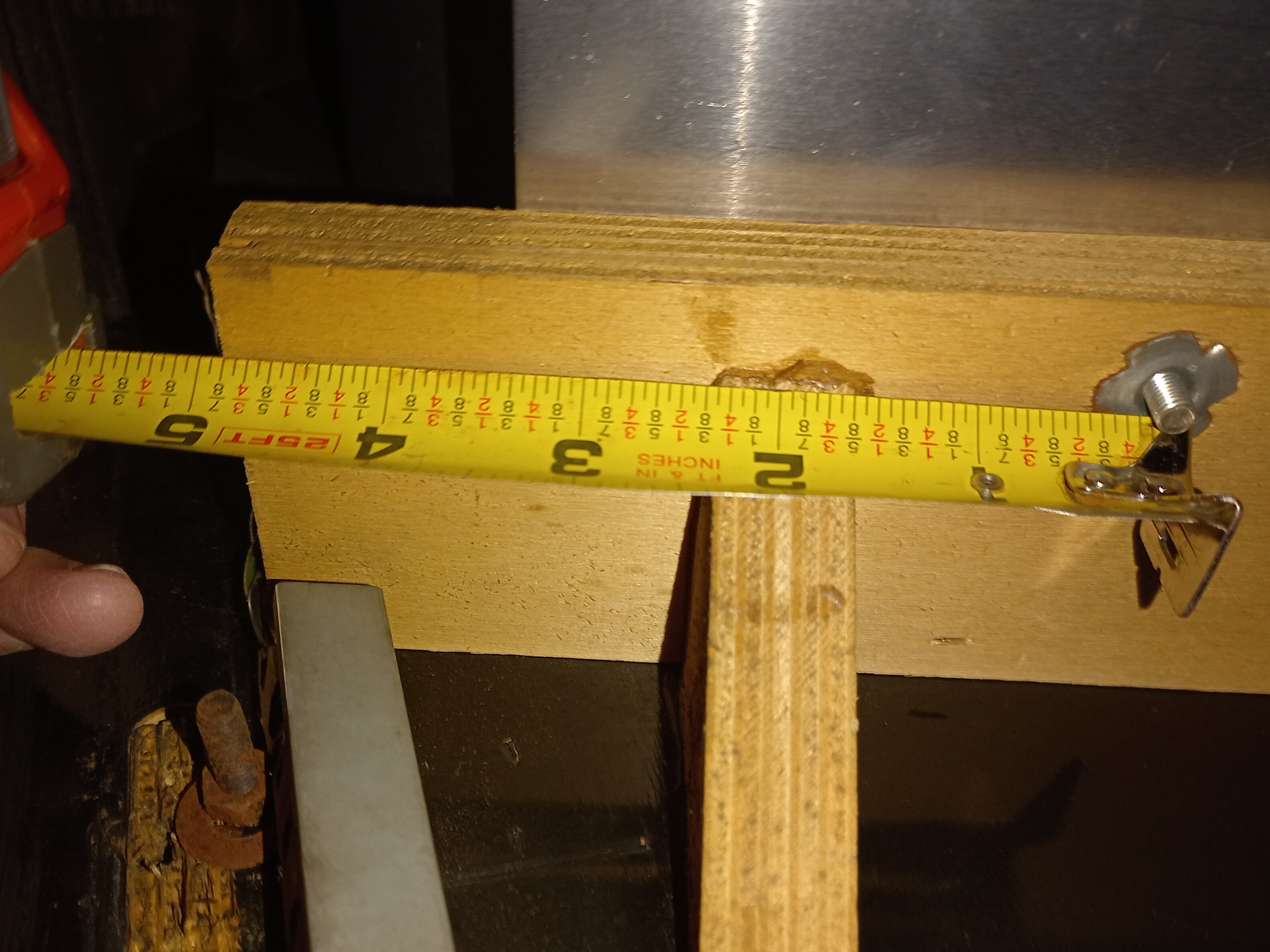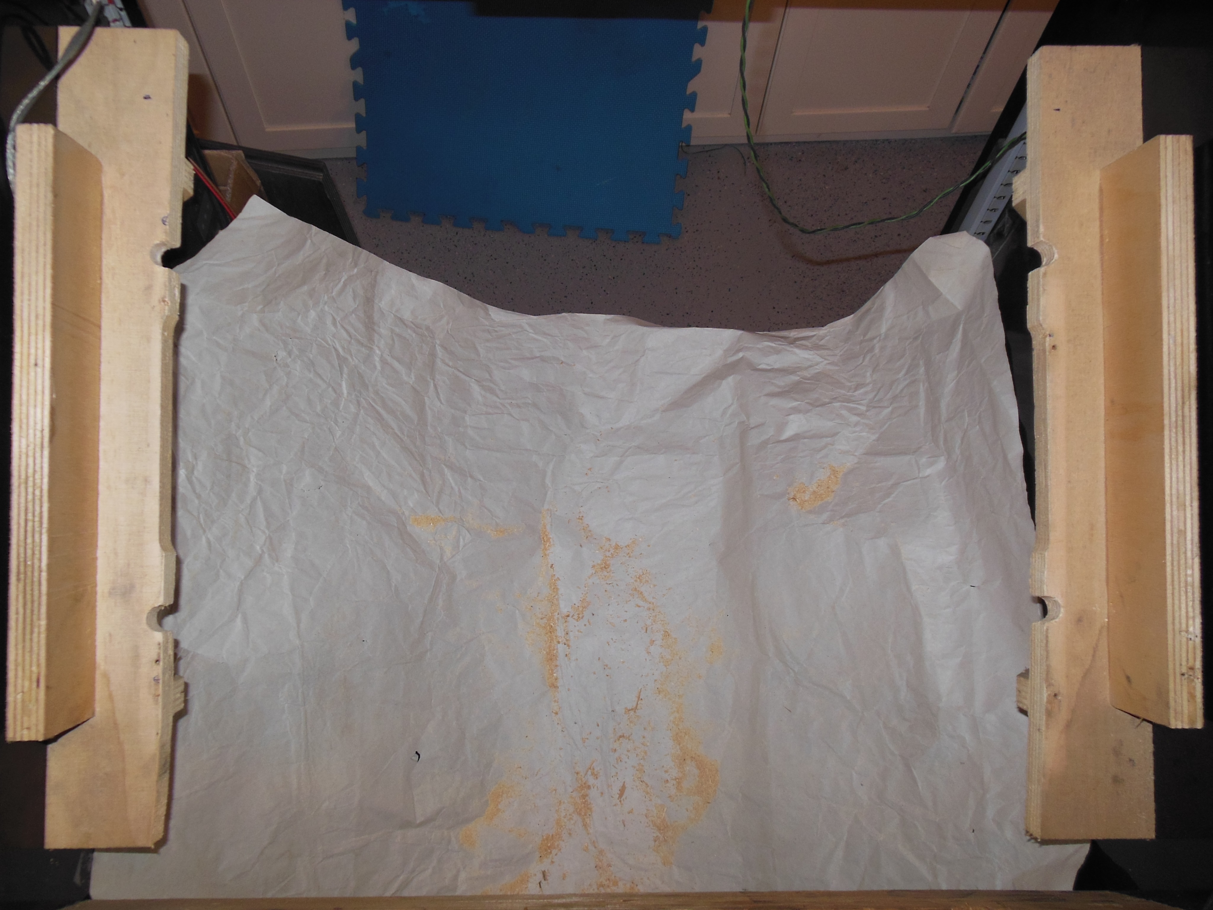After drilling the holes in the side plates, corresponding 'U' cut-outs were trimmed from the side wall shelves to accommodate the nuts. It was a tight fit getting everything lined up but the finished assembly was solid and level.