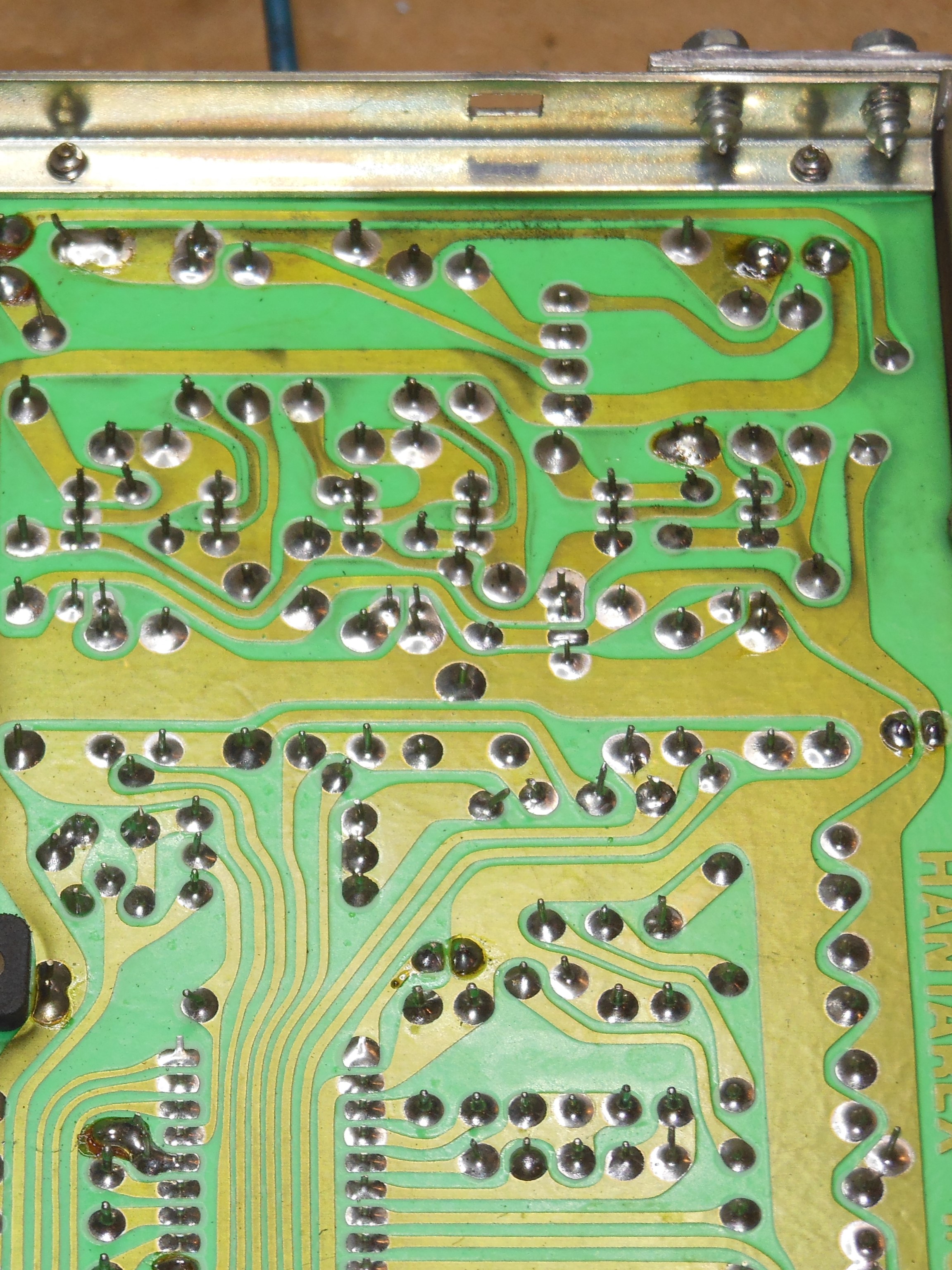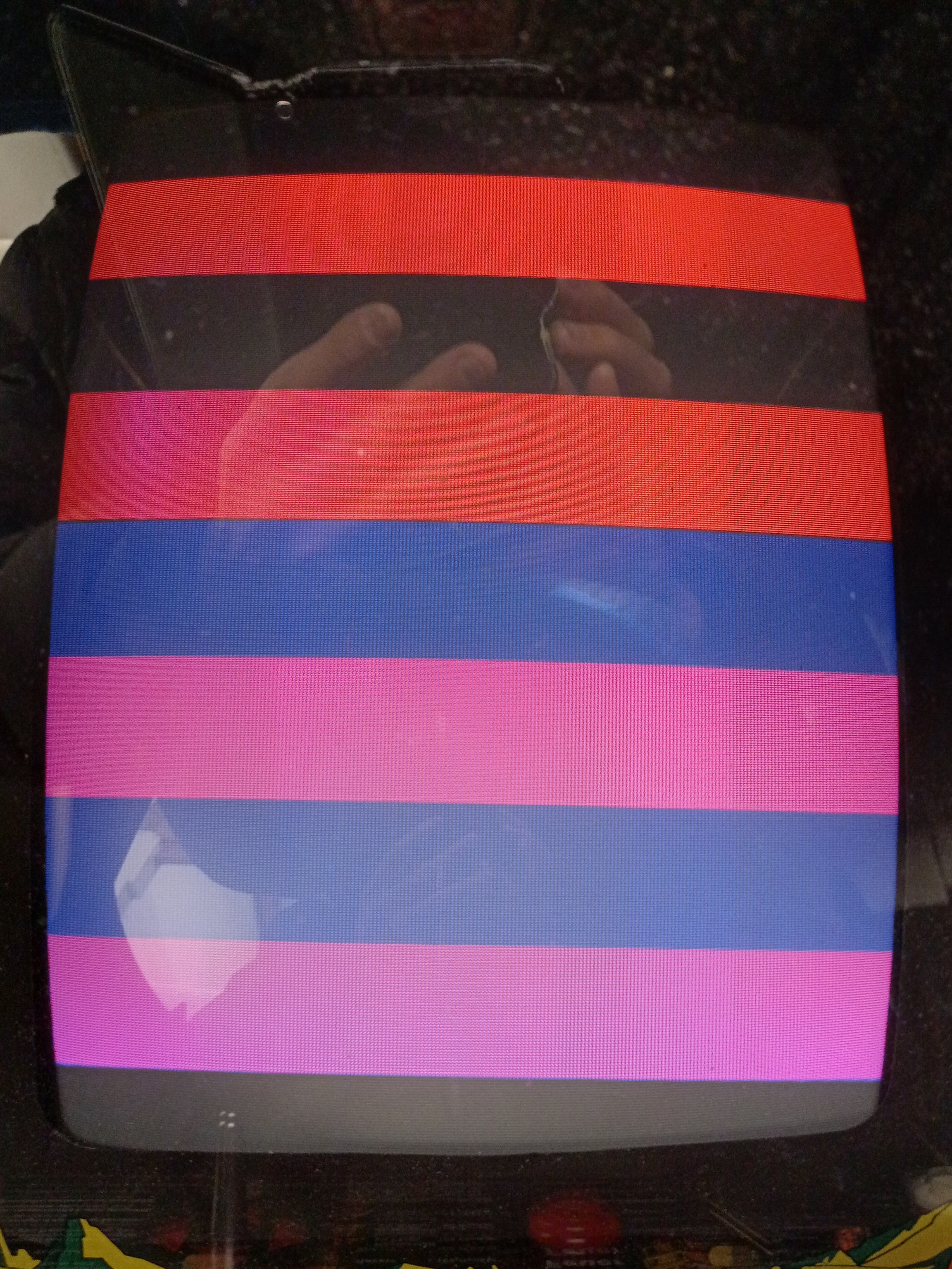 Pre-show testing found the game missing colours. Tapping the side of the cabinet caused the colours to come and go. Attaching the Test Pattern Generator confirmed that the intermittent missing green was a monitor chassis problem, and the chassis was removed for repair. Visual inspection on the bench found dry joints on TR 11 and TR 12 transistors. Five of the six pins were loose and the whole back third section of the PCB was reflowed. Reinstallation and retest of the chassis confirmed stable green and no further intermittency.